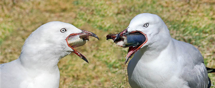 Seagulls share a small fish