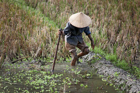 Man working in de rice fields in...